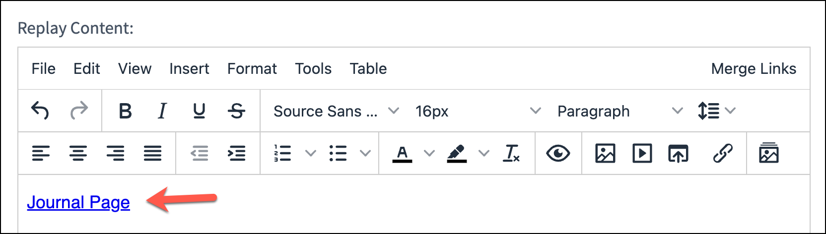 You can also insert the link to the Journals page using the handy Merge Links option in several areas: