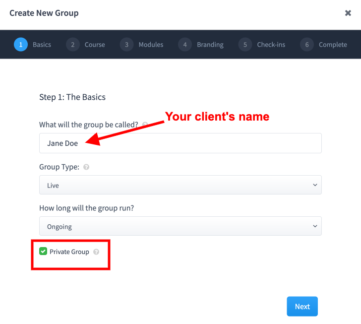 Step 2. Under the 'Basics' tab, use your client's name as the group name (e.g. "Jane Doe") and make sure to check 'Private Group' box.
