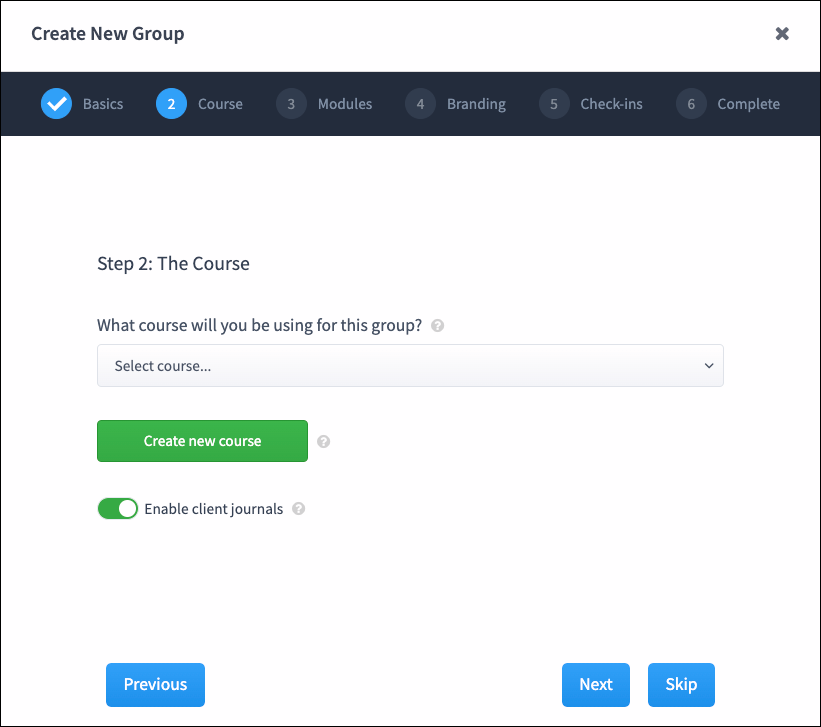 Step 4. Under Modules, choose how often the modules should be delivered by clicking the dropdown menu for options. Then choose the release date of the first module. Then click the Next button. Even though you don't have any course modules, you might still choose to share a resource with clients in this group.