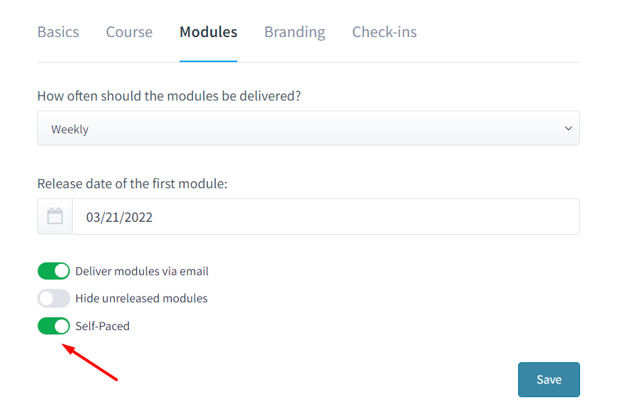 Groups can be set to “Self-Paced” allowing clients to unlock the next module as soon as the previous modules are marked “Complete”. This setting will allow your clients to control the release of the modules and work at their own pace, without waiting for you to release the next module.