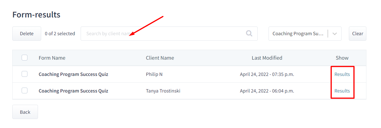Once you click on the Results icon, you'll see which clients completed the form and what results they got. You can also search the results by client's name.
