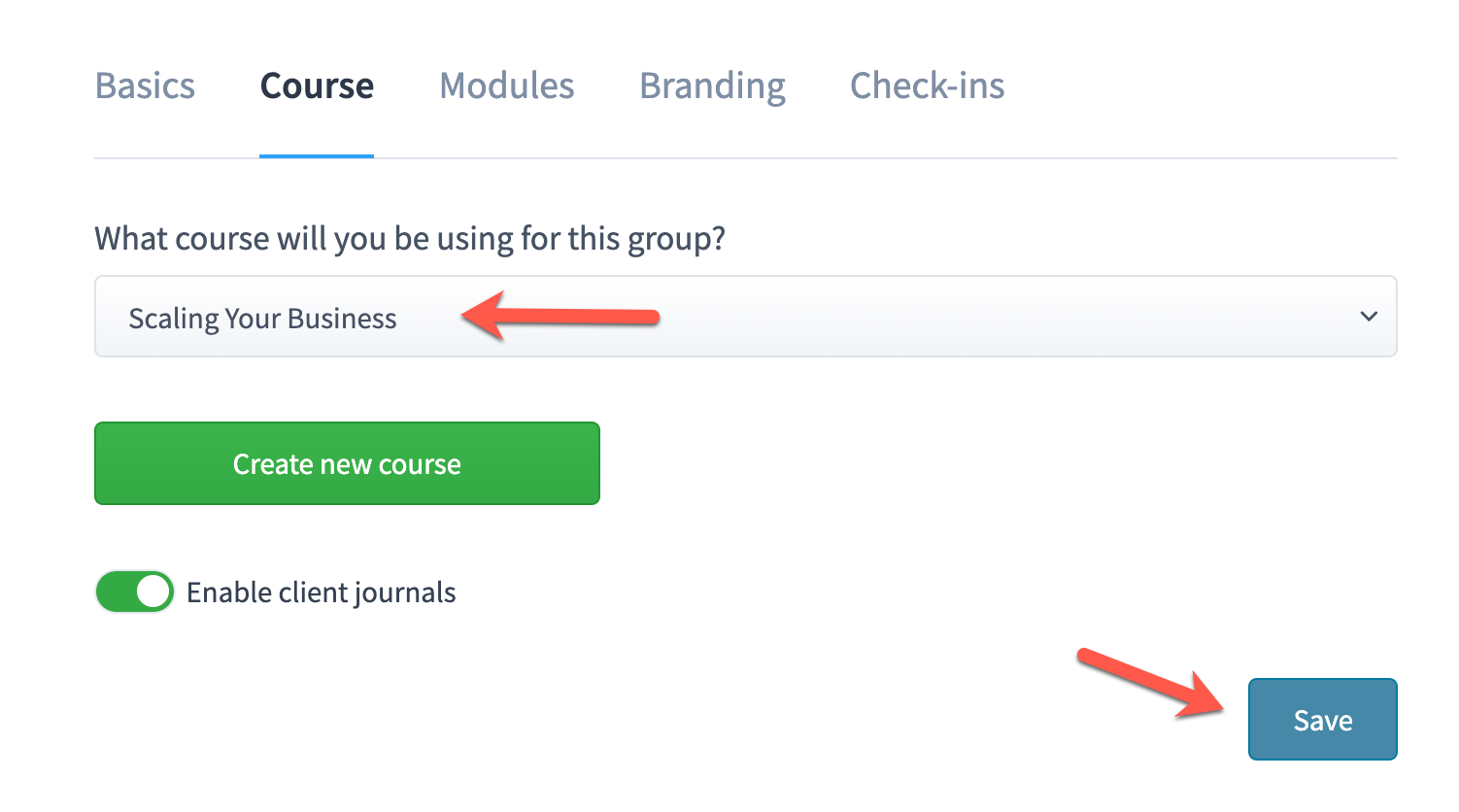 Step 4. Choose the name of the course under "What course will you be using for this group?" Then click the Save button.