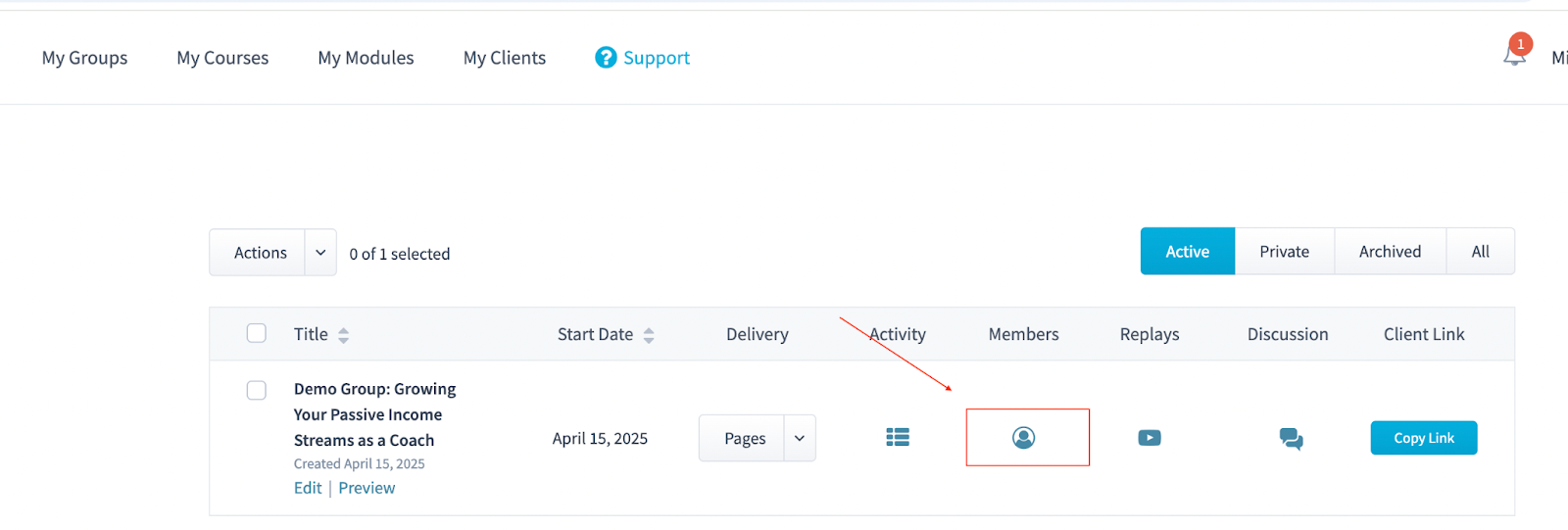 Once reactivated, the group will now appear in the client’s portal.