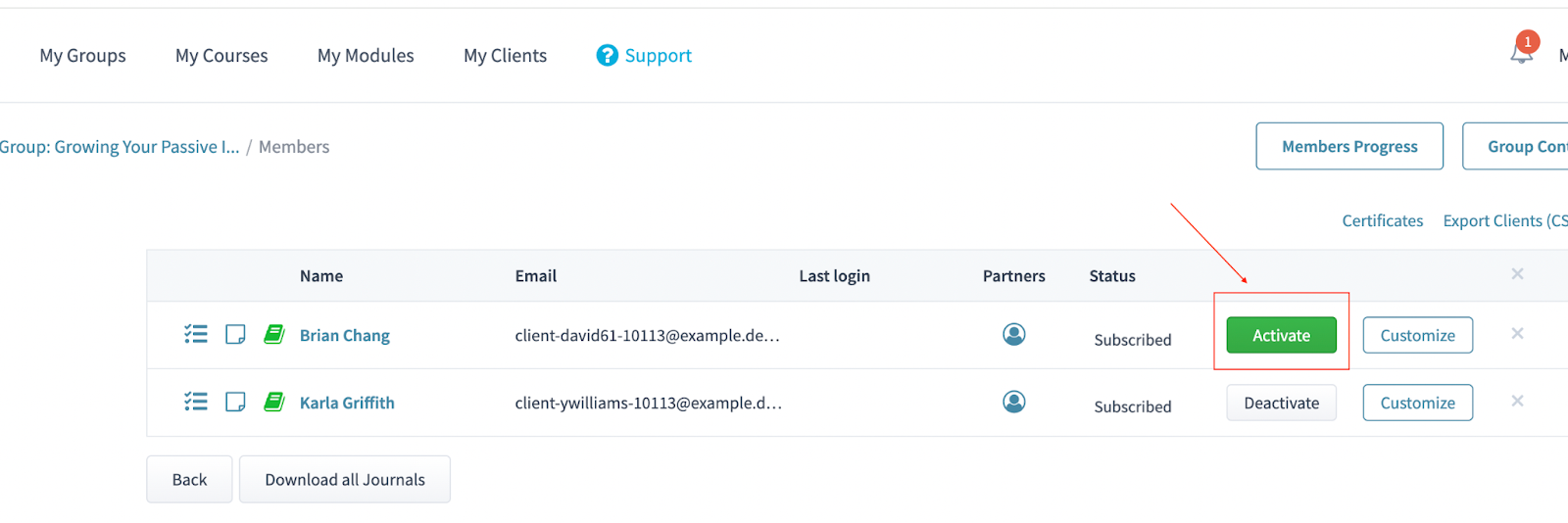 If you see the status “Activate,” that means the member has been deactivated from the group. This is the reason the client cannot see or join the group.